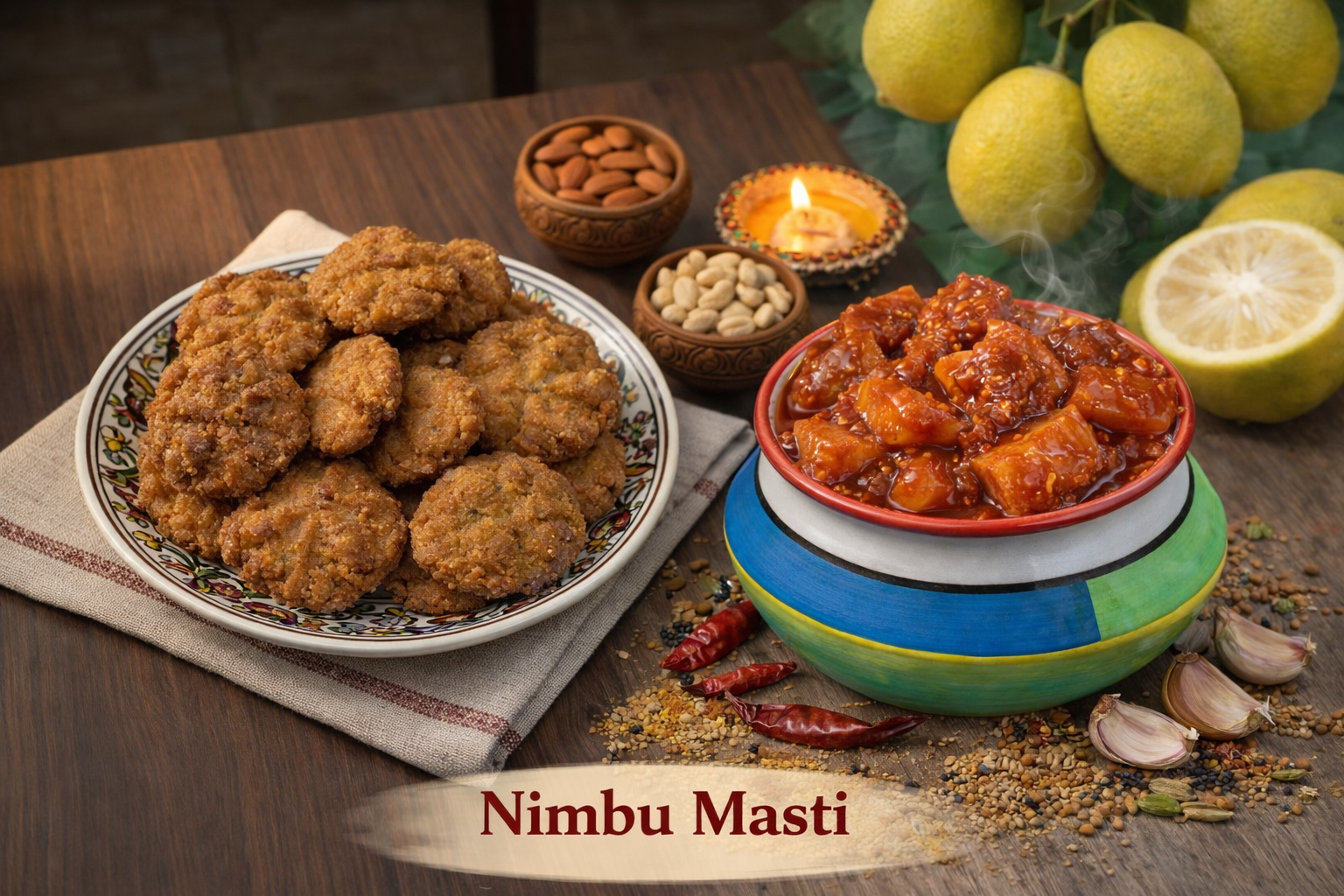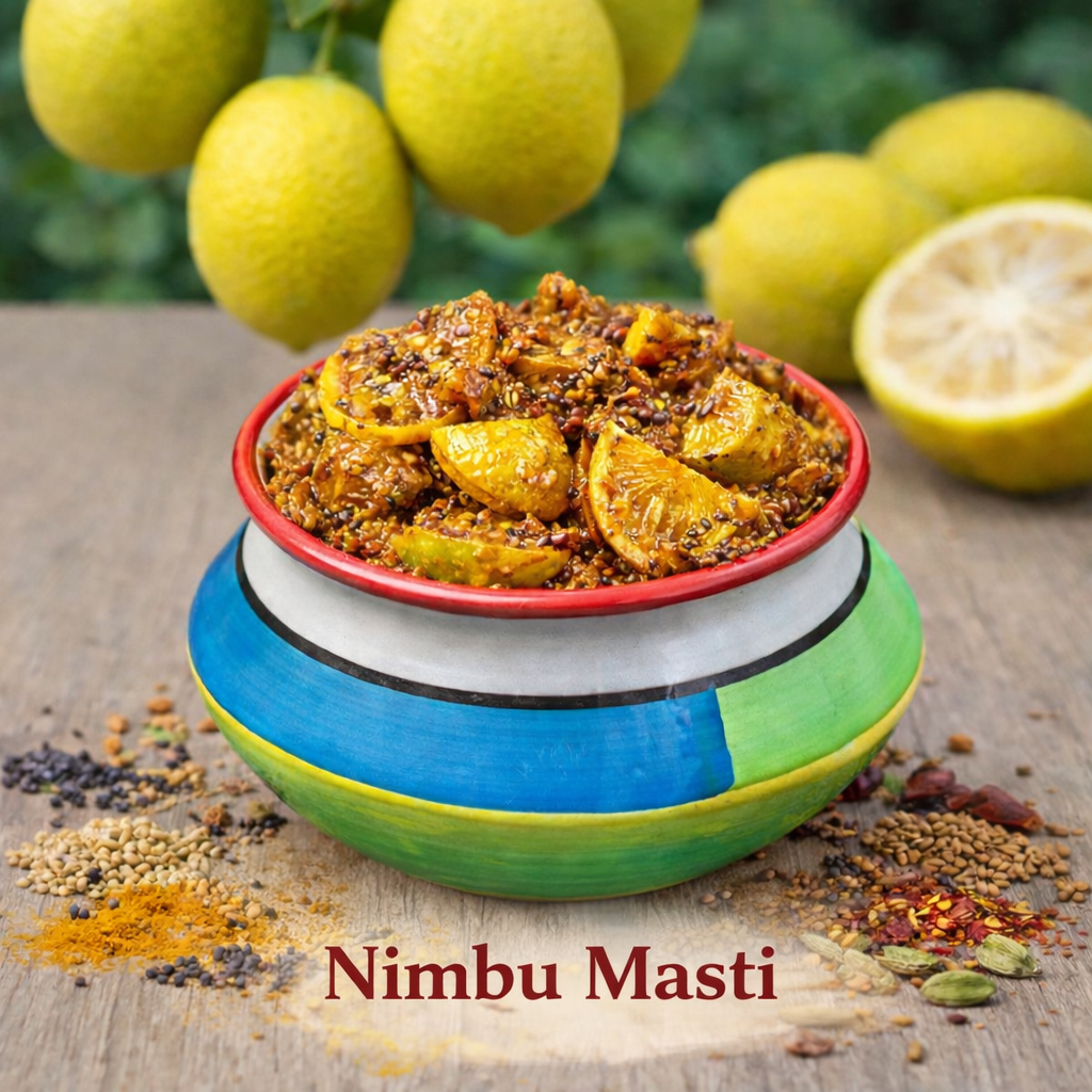 Nimbu Masti (खट्टी–मीठी अचार): Handpicked lemons and spices naturally sun-cured for 90 days, achieving a rich, well-balanced flavor that embodies the essence of village-style pickling.